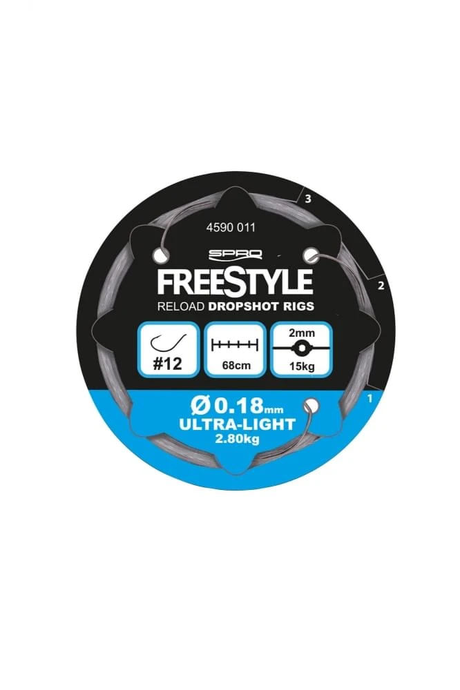 De Reload Dropshot Rig is een kant en klare fluorocarbon onderlijn van Freestyle. De lijn is al voorgeknoopt met Gamakatsu DSG haken en zit op een handig spoeltje. Je knoopt de hoofdlijn aan het bevestigingsoogje en je stelt de gewenste diepte in met een Pear Sinker.