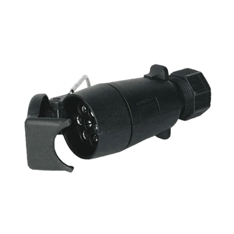 Losse contrastekker met 7 polen en verende klep. Wordt gebruikt voor de rijverlichting en voor stroom voor bijvoorbeeld de koelkast van de caravan.