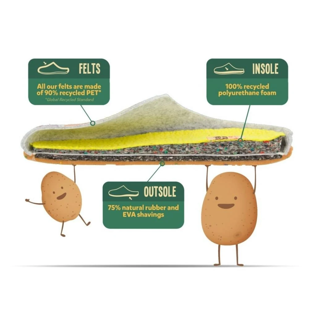 Naast het stijlvolle design zijn de herensloffen van Hot Potatoes ook nog eens een milieubewuste keuze. Hot Potatoes maakt bij de productie van haar sloffen namelijk gebruikt van gerecyclede materialen. Zowel in de sloffen zelf als in de verpakking van de sloffen. Â