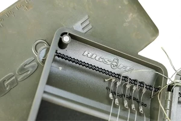 In de safe is er plek voor 50 onderlijnen en door de dubbele pins te gebruiken is het ook mogelijk om onderlijnen die nog niet voorzien zijn van een wartel of lus op te bergen. Hierdoor kan je nog op het allerlaatste moment de lengte bepalen. Voor het opbergen van wartels, rig pins, kwik links of haken heeft de Rigsafe nog 3 vakken. De Safe sluit je gemakkelijk met de magneetsluiting zodat je hem ook makkelijk open en dicht krijgt met natte en/of koude handen.