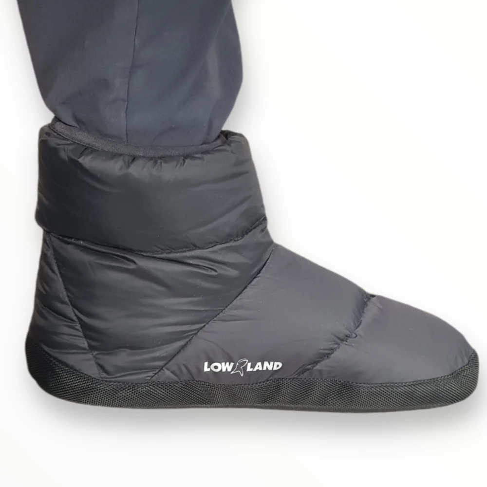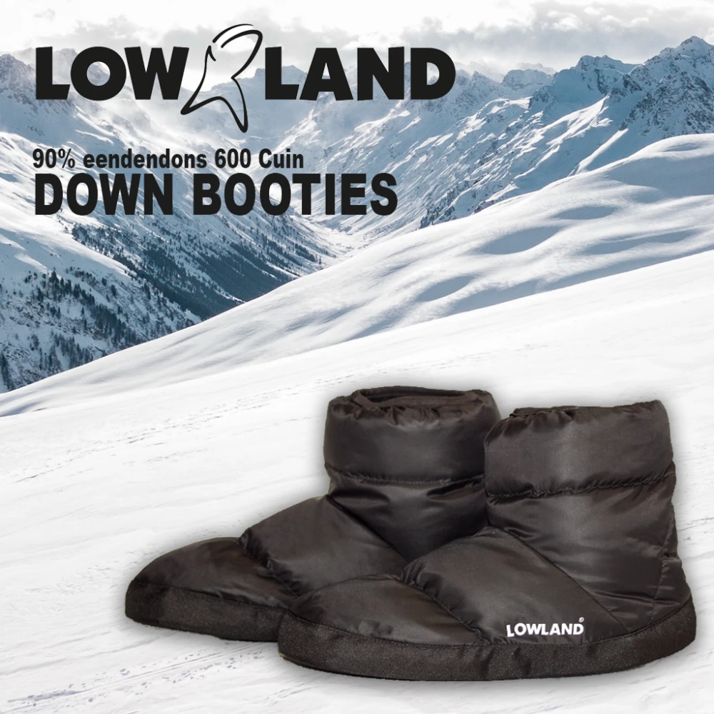 Geen koude voeten meer met deze Lowland sloffen gevuld met 90% 600 cuin eendendons. De binnenvoering is gemaakt van heerlijk fleece en ze hebben een sterke antislipzool. Het oppervlakteweefsel is gemaakt van spatwater- en regendicht 410D rip-stop Nylon. Makkelijk op te vouwen en mee te nemen in het meegeleverde opbergzakje.