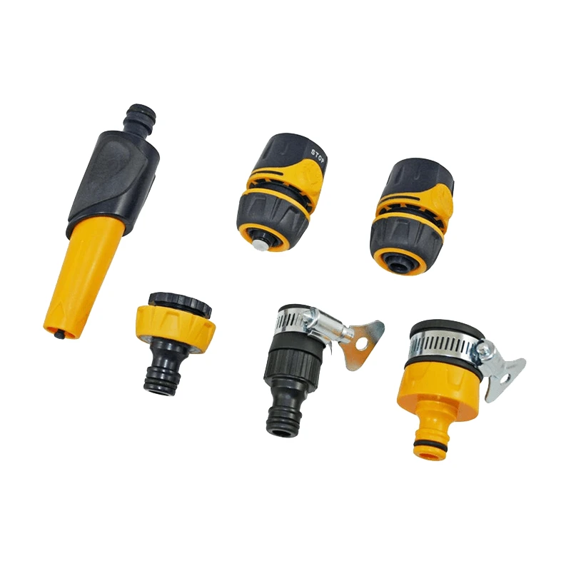 Set van 6 koppelingstukken voor waterkraan en waterslang. De set bevat een spraymond, kraanadapter 3-4 / 1-2, kraan adapter klein, kraanadapter groot, slangverbinder met eindstop en een slangverbinder zonder eindstop. Ideaal voor de vele verschillende kraanaansluitingen in Europa.