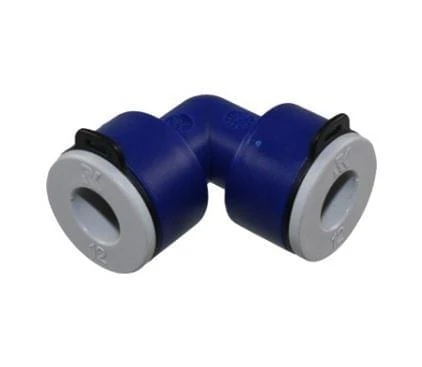 Deze UniQuick Hoekverbinder is bedoeld om twee waterleidingbuizen met een diameter van 12 mm aan elkaar te verbinden. Dit gebeurd onder een hoek van 90 graden.