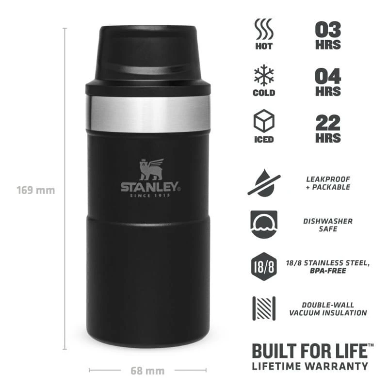 Voor wie vroeg op pad moet kan wel een sterk kopje koffie gebruiken om wakker te worden. Als geen ander heeft Stanley een thermosbeker in het assortiment die aan alle eisen voldoet. De beker is lekvrij, houd je kopje koffie of andere warme drank tot wel 3 uur warm en kan gewoon in de vaatwasser.