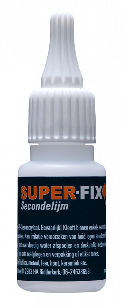 De secondelijm van Super-Fix is een uniek samengestelde ethyl-2-cyanoacrylaat lijm voor verschillende combinaties van materialen. Deze lijm is snelhardend en geeft een zeer sterke verbinding. Geschikt voor onder anderen kunststoffen, rubber, metalen, porselein, keramiek, hout en leer.
